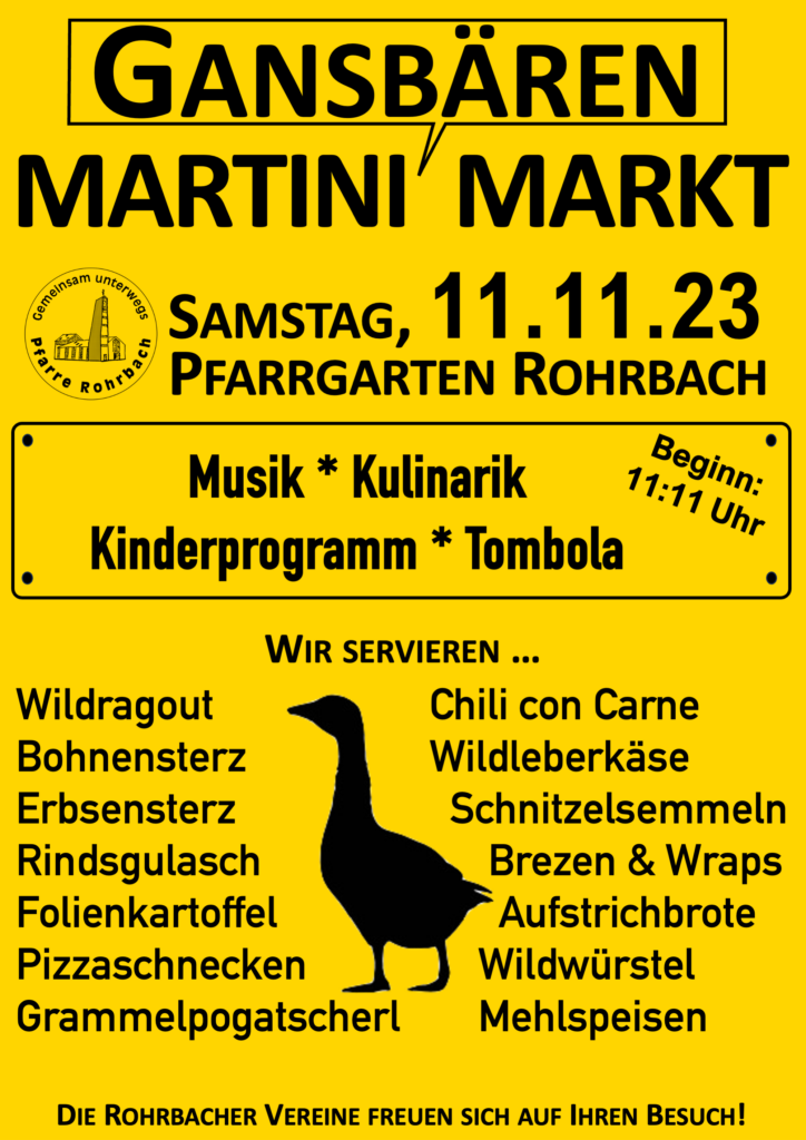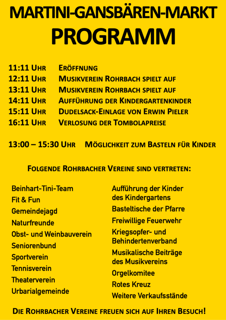 Am Gansbären-Martini-Markt, der heuer am Festtag des Heiligen Martins, am 11. November 2023 stattfindet, beteiligen sich über 16 Vereine aus Rohrbach. Das musikalisch bunte Rahmenprogramm startet um 11:11 Uhr. Der Musikverein Rohrbach, die Dudelsackeinlage von Erwin Pieler, ein Drehorgelspieler und die Aufführung der Kindergartenkinder sorgen für Kurzweiligkeit.