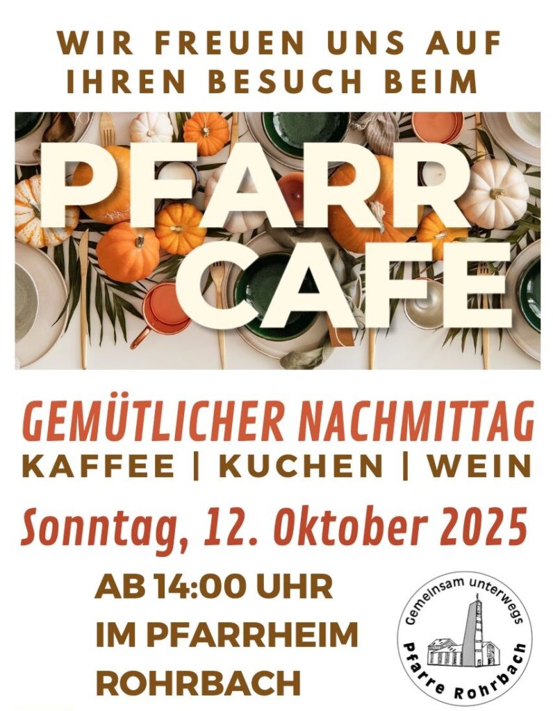 Am Nachmittag lädt der Pfarrgemeinderat zum Pfarrcafe ins Pfarrheim Rohrbach zu Kaffee, Kuchen, einer kleinen Jause und einem Gläschen Wein. Ab 14:00 Uhr können Mehlspeisen auch abgeholt werden.